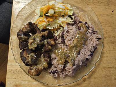 - Combine the Rice and Beans, Griot and Pikliz on a plate.